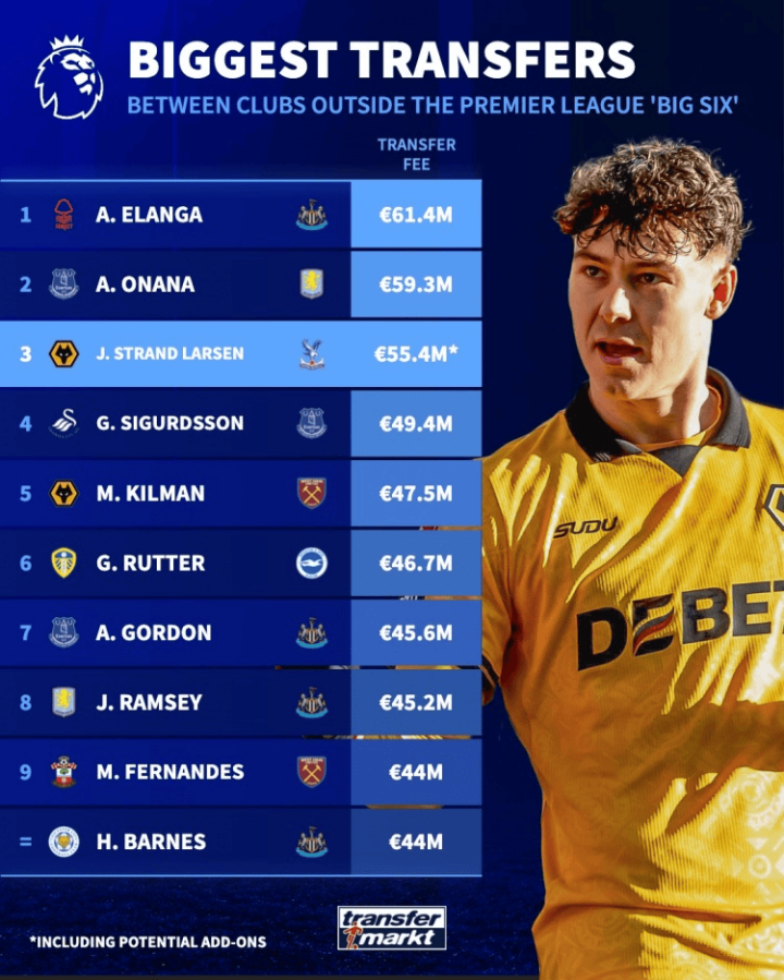 虎扑02月04日讯德国转会市场盘点了英超非BIG6球队历史上引进转会费最贵的球员,埃兰加位居榜首,拉尔森第三。